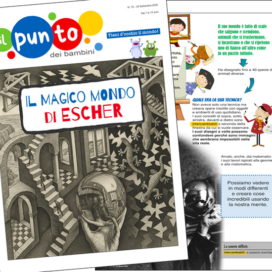 4 pagine in formato pdf da stampare o da leggere online. Escher, la sua arte e le sue opere maggiori raccontate ai bambini con un linguaggio adatto alla scuola primaria. La quarta pagina è dedicata ad un’attività interattiva. Dal giornale Il Punto dei bambini, l’attualità a misura di bambino.
